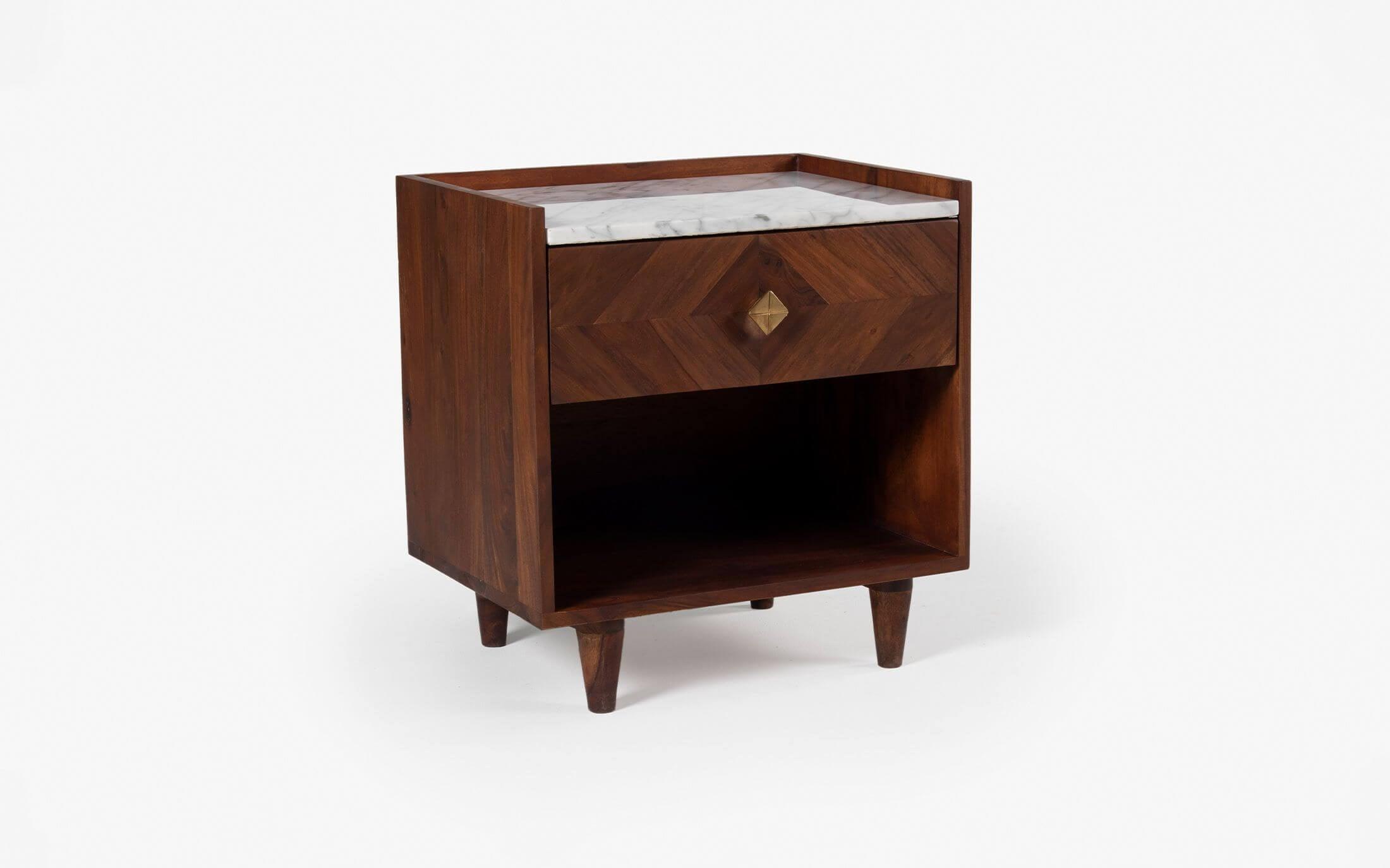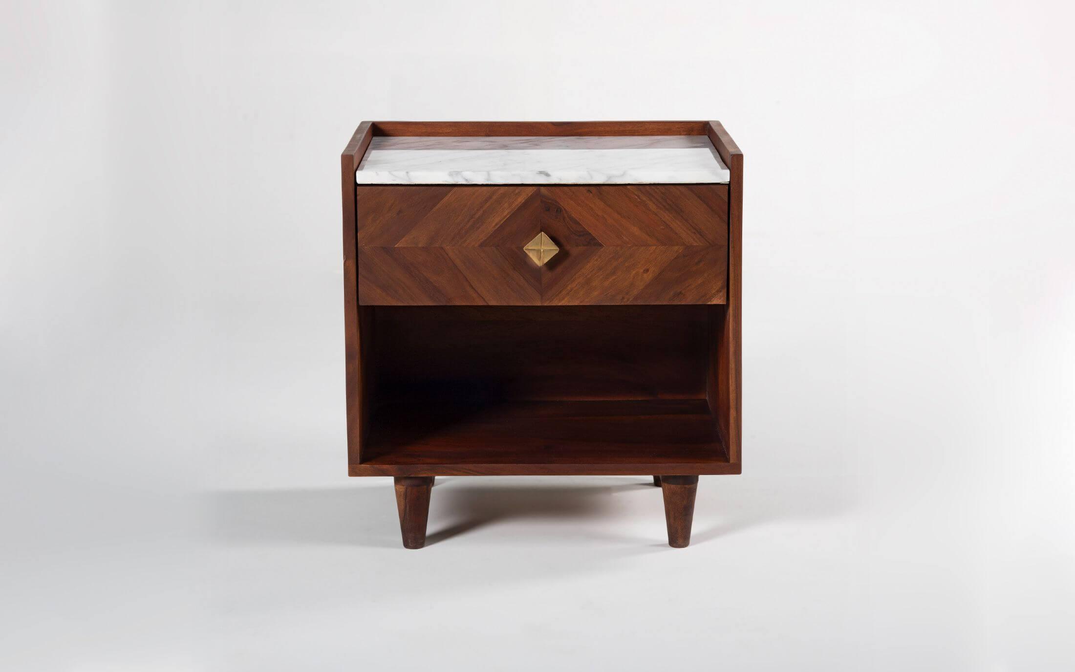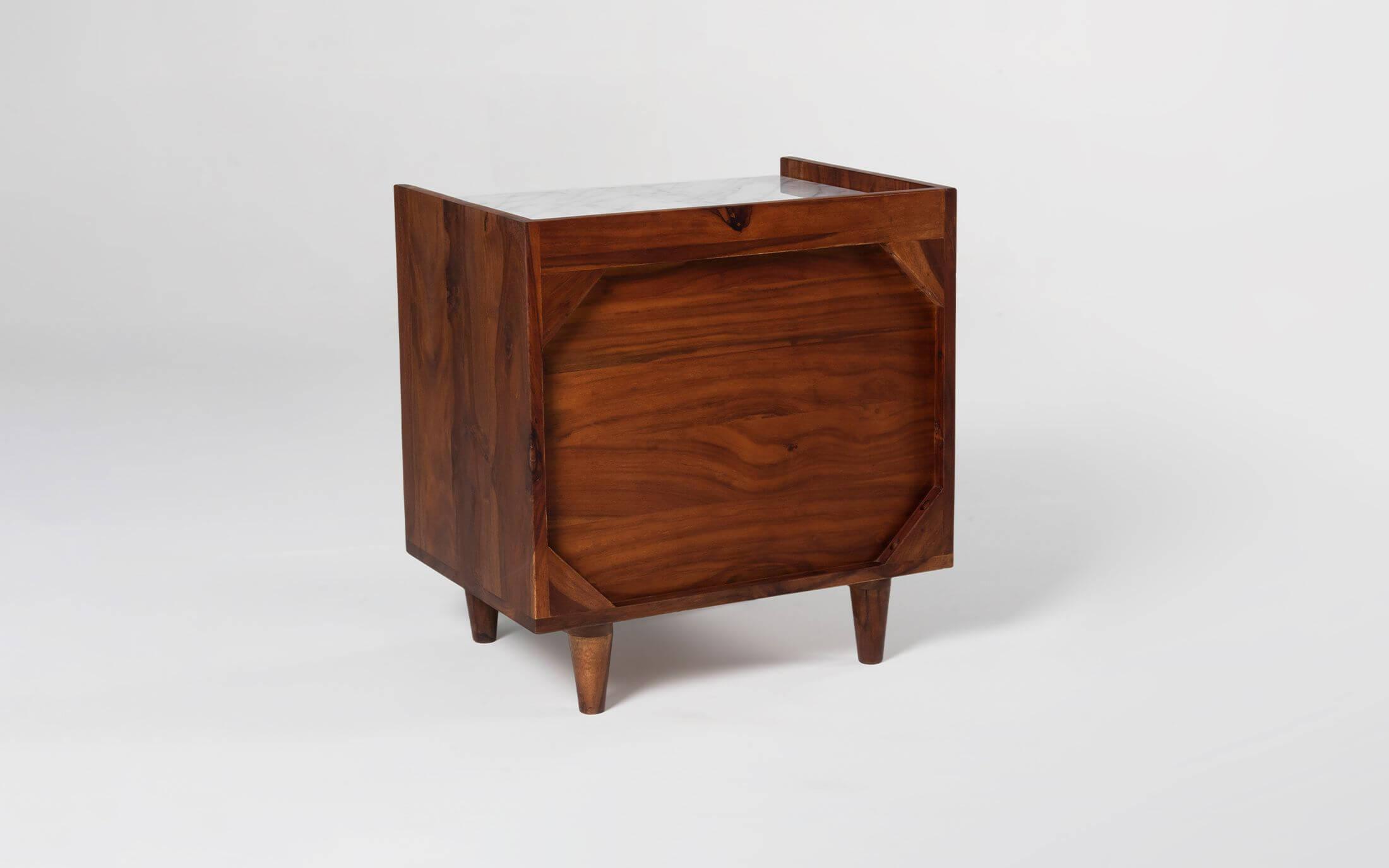Dado collection ensues a visual treat by creating patterns using the grains of sheesham wood. The symmetry thus formed is achieved with meticulous precision. The wood used is sheesham wood with Autumn Brown finish. Taking minimalism a step ahead is Orangetree’s inspiration with this collection. The Dado Bedside Table is a beautiful, modern looking side table for a bed with a marble top that compliments any bedroom decor. With this perfect addition to your bed, you are sure to be sure to enjoy the beauty of some new furniture for your bedroom!