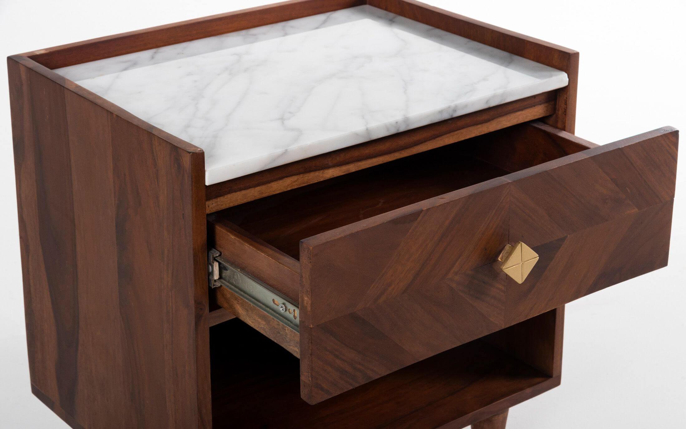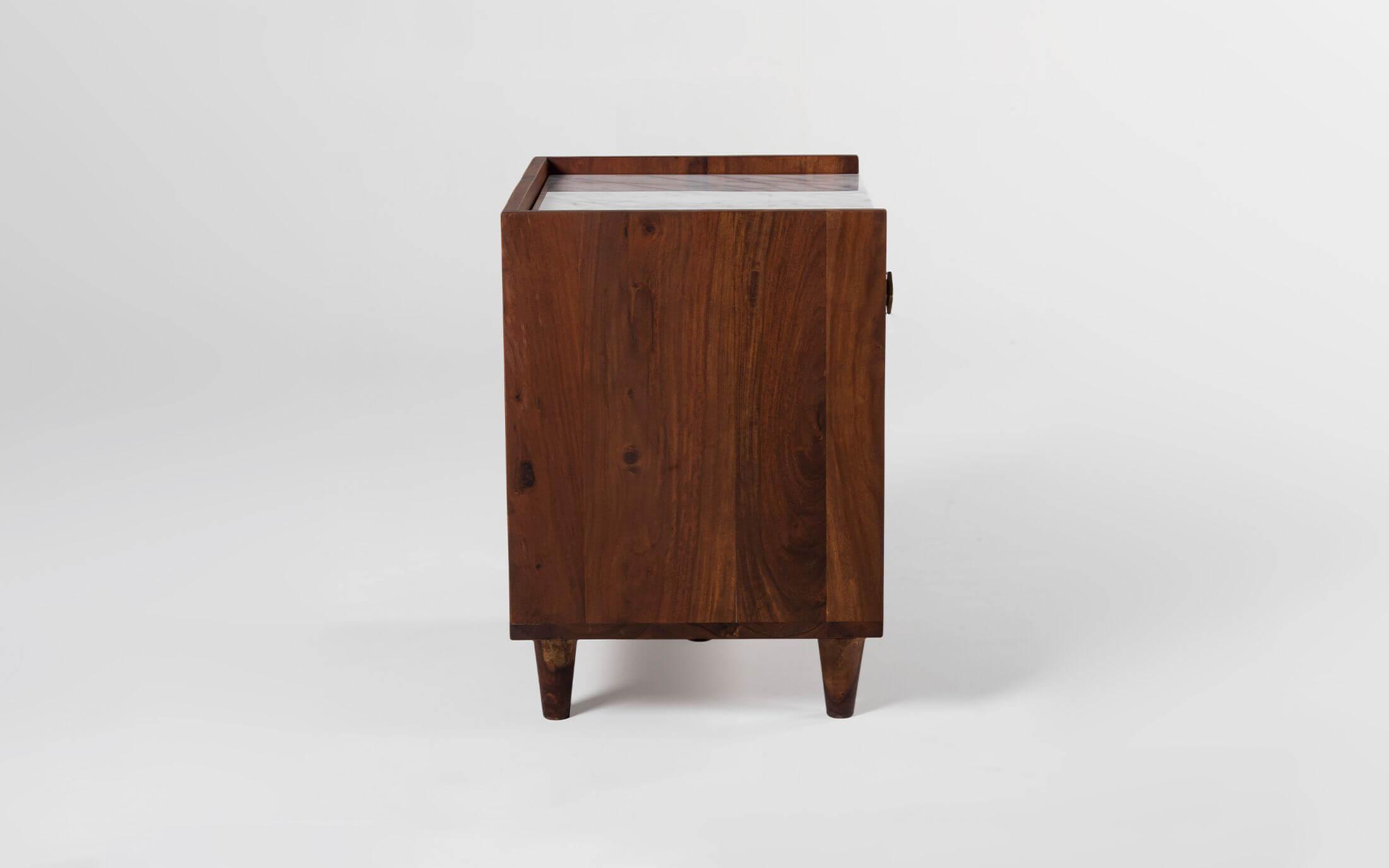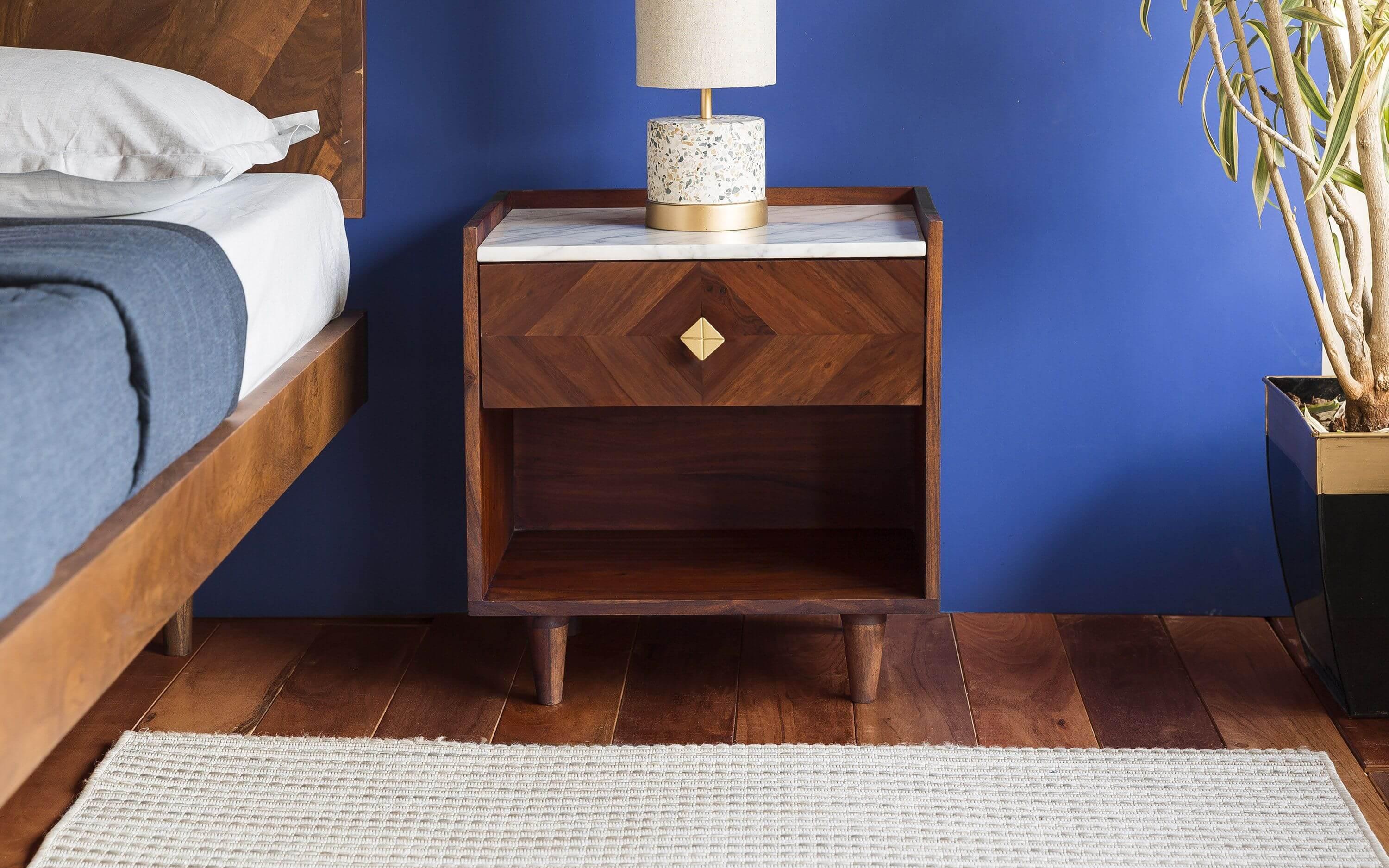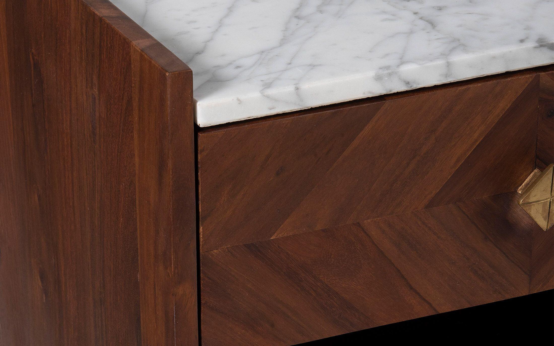 Dado collection ensues a visual treat by creating patterns using the grains of sheesham wood. The symmetry thus formed is achieved with meticulous precision. The wood used is sheesham wood with Autumn Brown finish. Taking minimalism a step ahead is Orangetree’s inspiration with this collection. The Dado Bedside Table is a beautiful, modern looking side table for a bed with a marble top that compliments any bedroom decor. With this perfect addition to your bed, you are sure to be sure to enjoy the beauty of some new furniture for your bedroom!