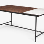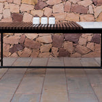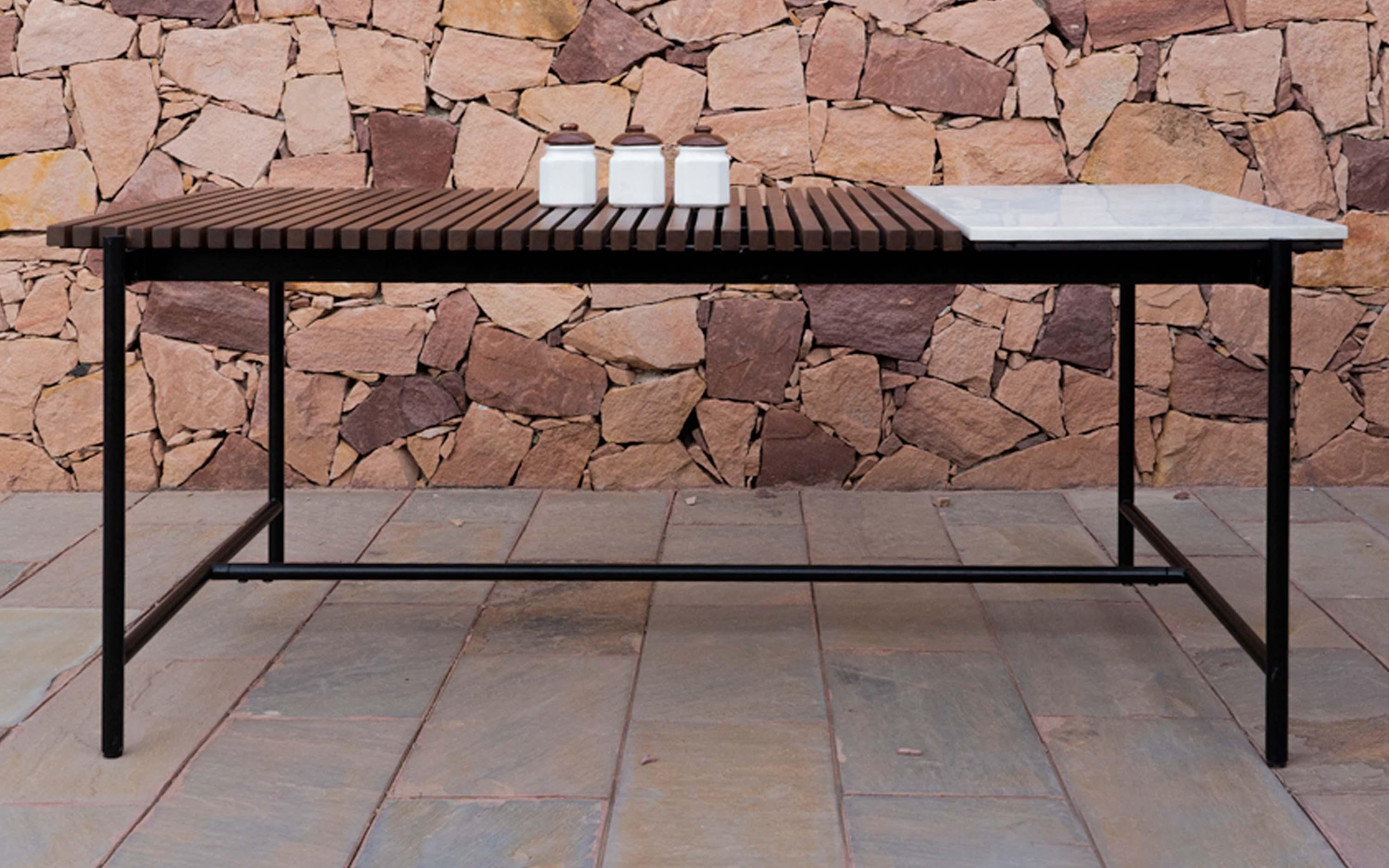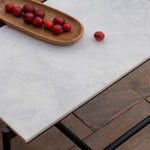 Upgrade your outdoor gatherings with the Covent marble top dining table . The Garden Outdoor Dining Table is beautifully designed with a strong steel frame and a Teak wood tabletop complemented by white marble. It's versatile for both indoor and outdoor use, making it an elegant centerpiece for your home and garden.