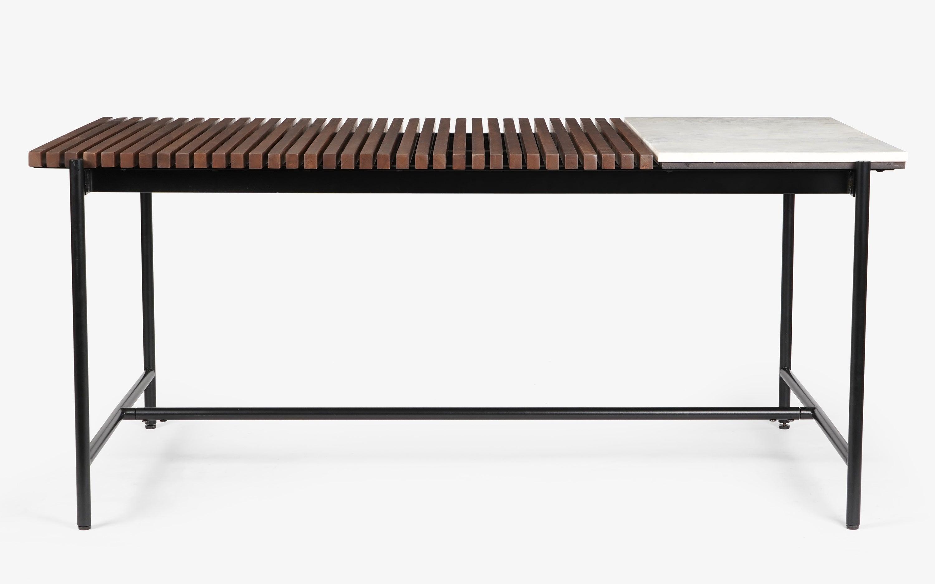- Dimensions: 175 L x 90 W x 76 H cmMaterial: Teak Wood, White Marble and Mild SteelFinish: Teak Brown Mahogony Finish on wood, White Marble and Black Powder Coating on metal.Assembly: Do-it-yourself (DIY) assembly with minimal effort with the help of the instruction sheet provided in the toolkit. You can also request an installation service through our customer care number, +91 9001190790.We can customize all furniture pieces in size, finish, and fabric on additional charge and extend delivery timelines if need be. For details, contact customer care.