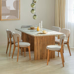 Enrich your home furnishings with this Hiro dining table and enjoy a lovely dining experience, accommodating 6 people. The marble-top dining table exclusively features Toronto marble that shines brightly and reflects a clean surface look. It has a sturdy construction along with a vertical pattern on solid wooden legs, is naturally finished and is made with acacia wood, which adds to its longevity and durability. Its bold and effective features easily blend with all decor styles, serving its purpose.