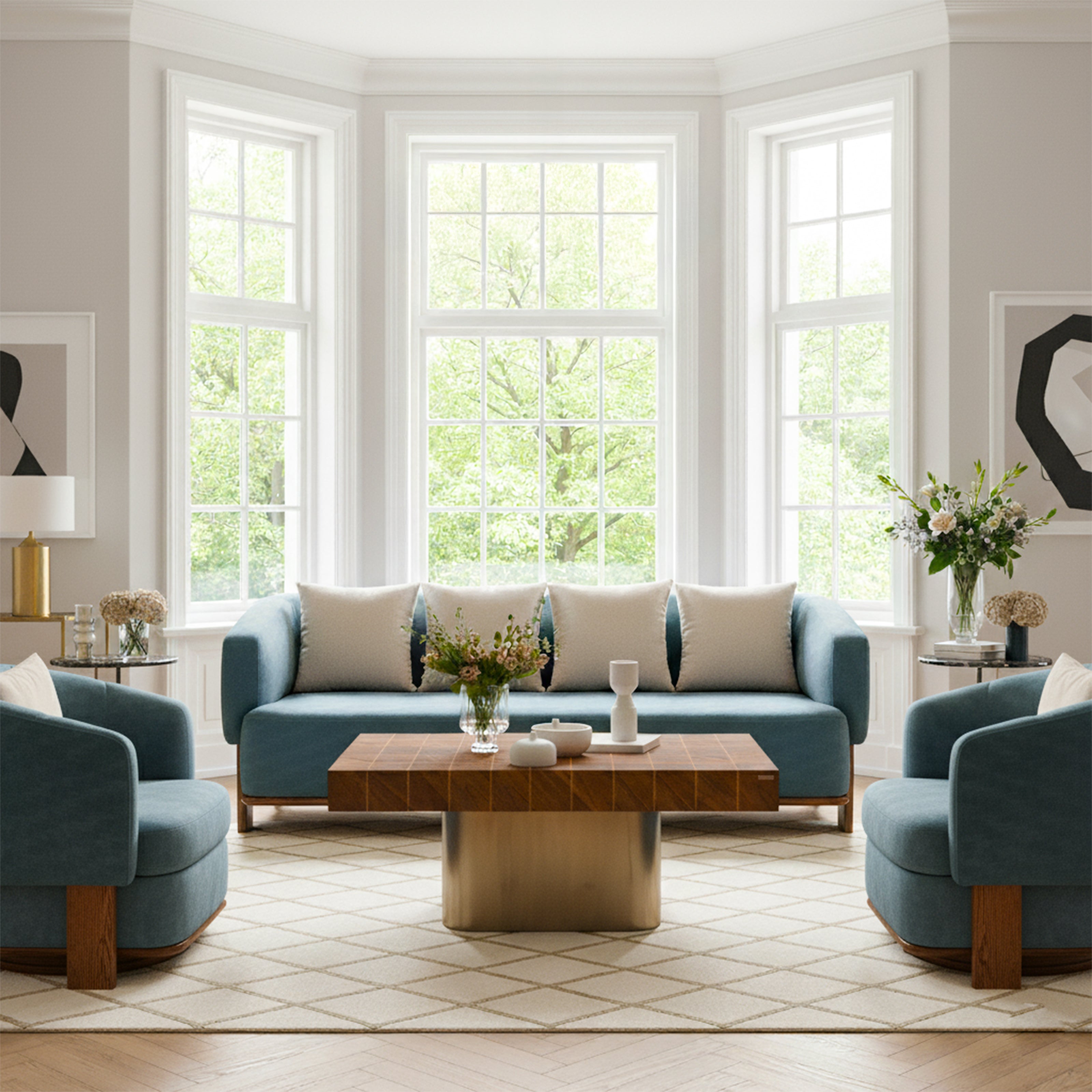 - All furniture pieces are fully customizable in wood type, fabric, and dimensions.