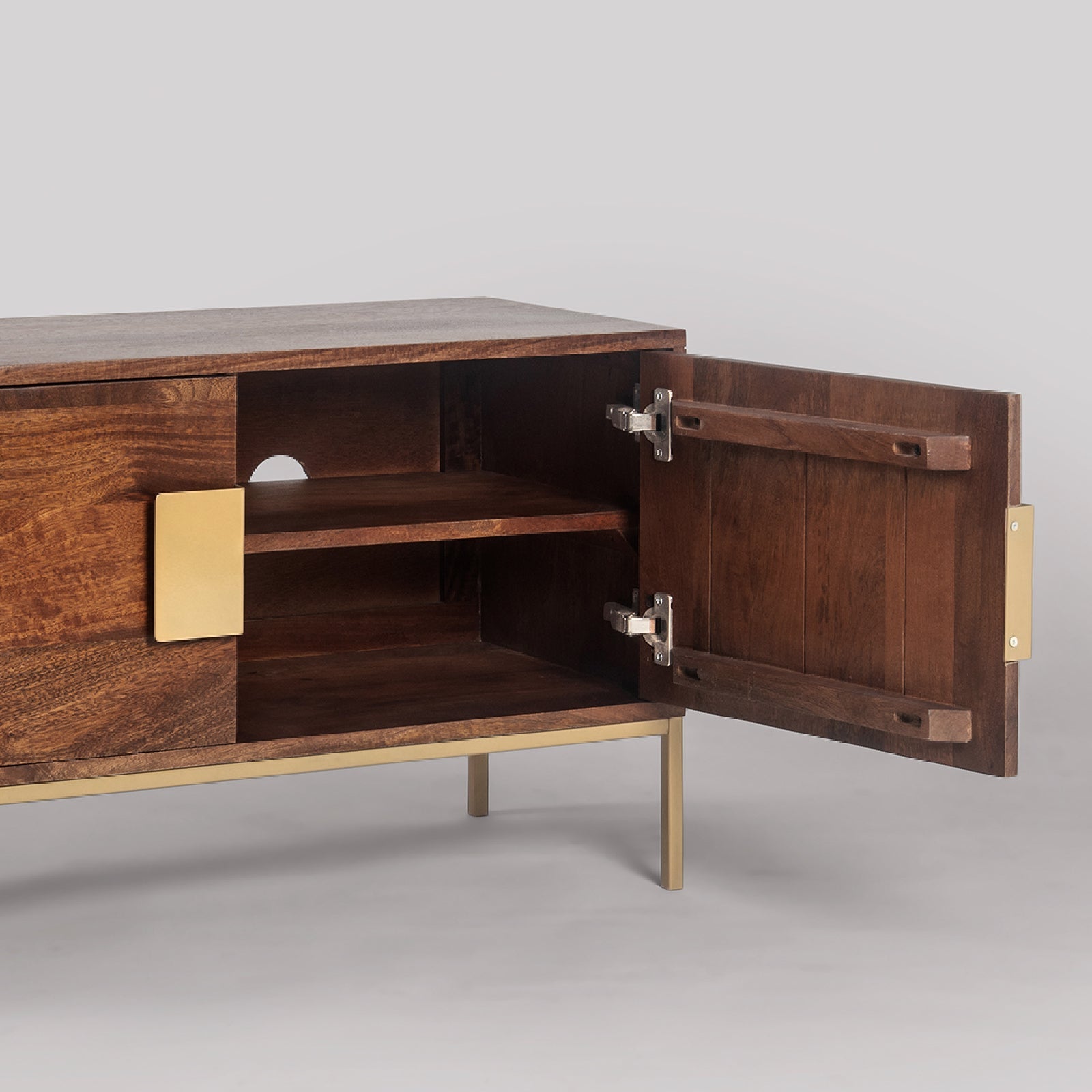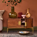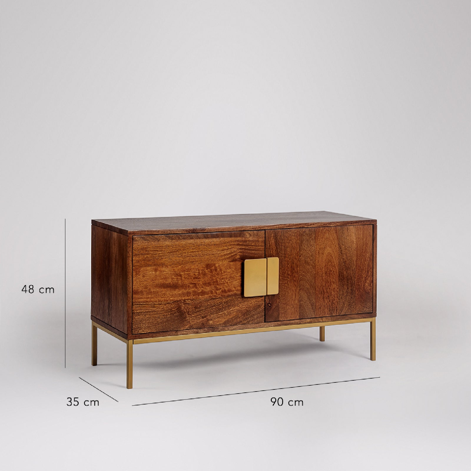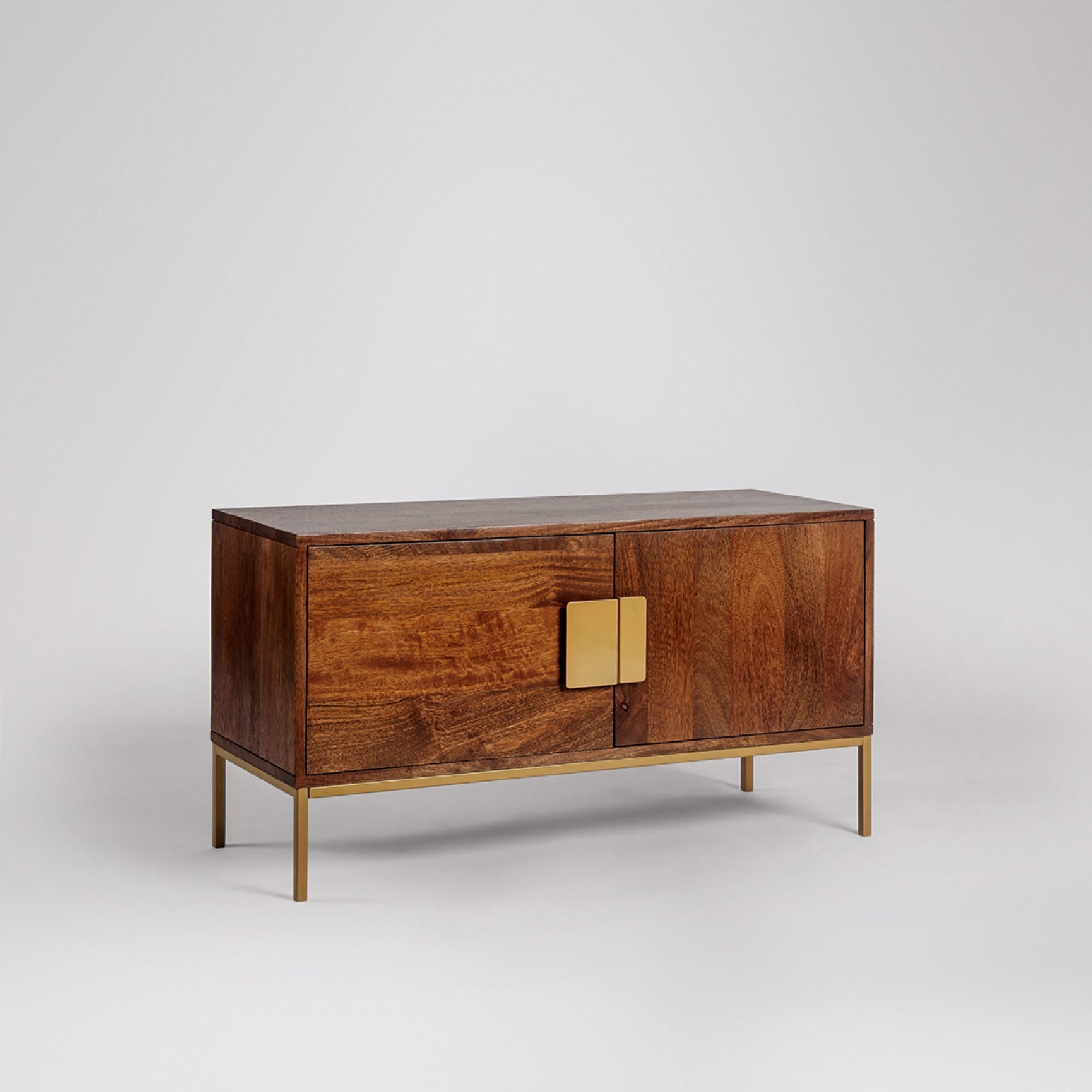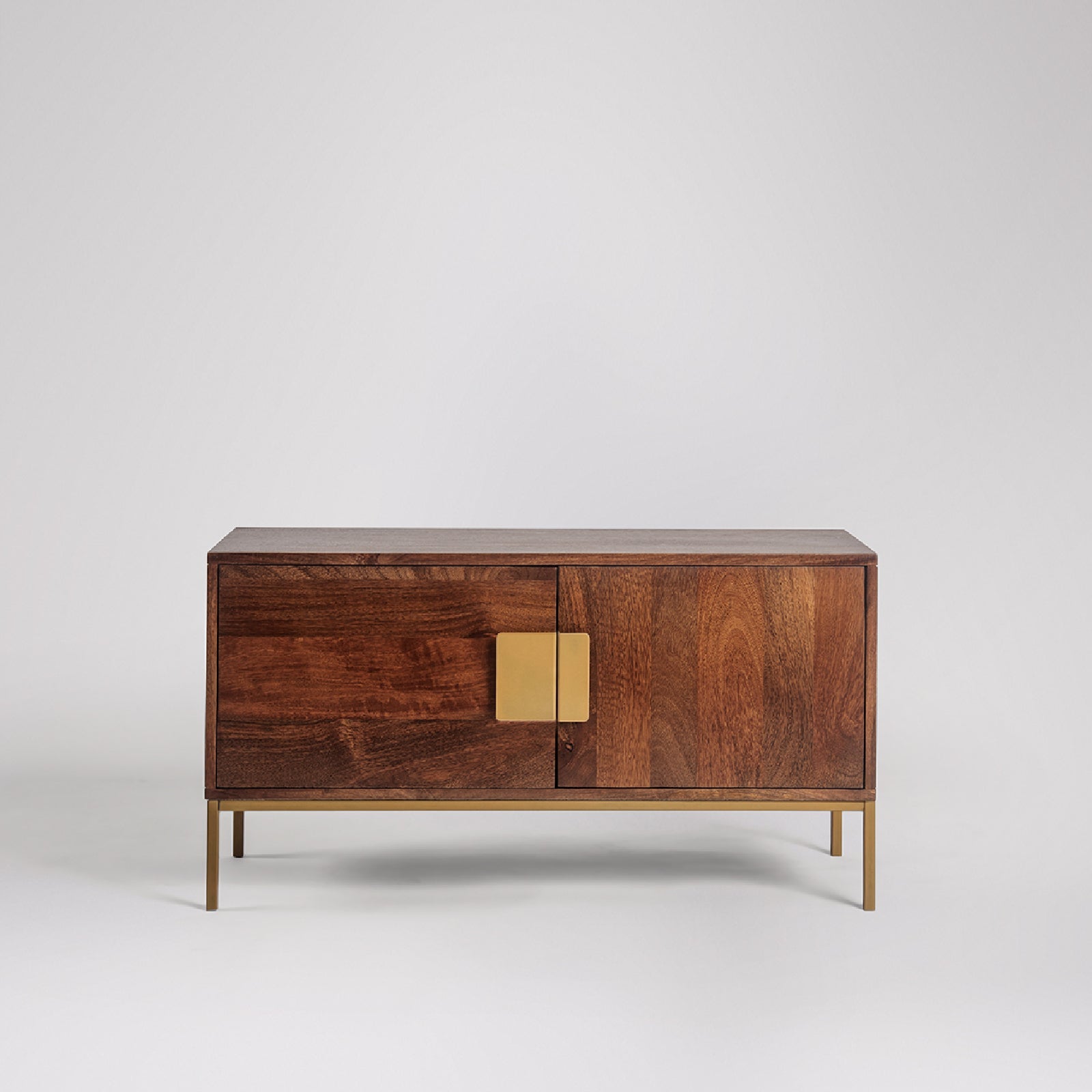 Banner has attitude—in the best way. The doors don’t match on purpose, the wood’s rich, and that little brass flash? It knows how to catch the light just enough. Whether it’s the center of your living room or quietly doing its job in the background, it’s never boring.