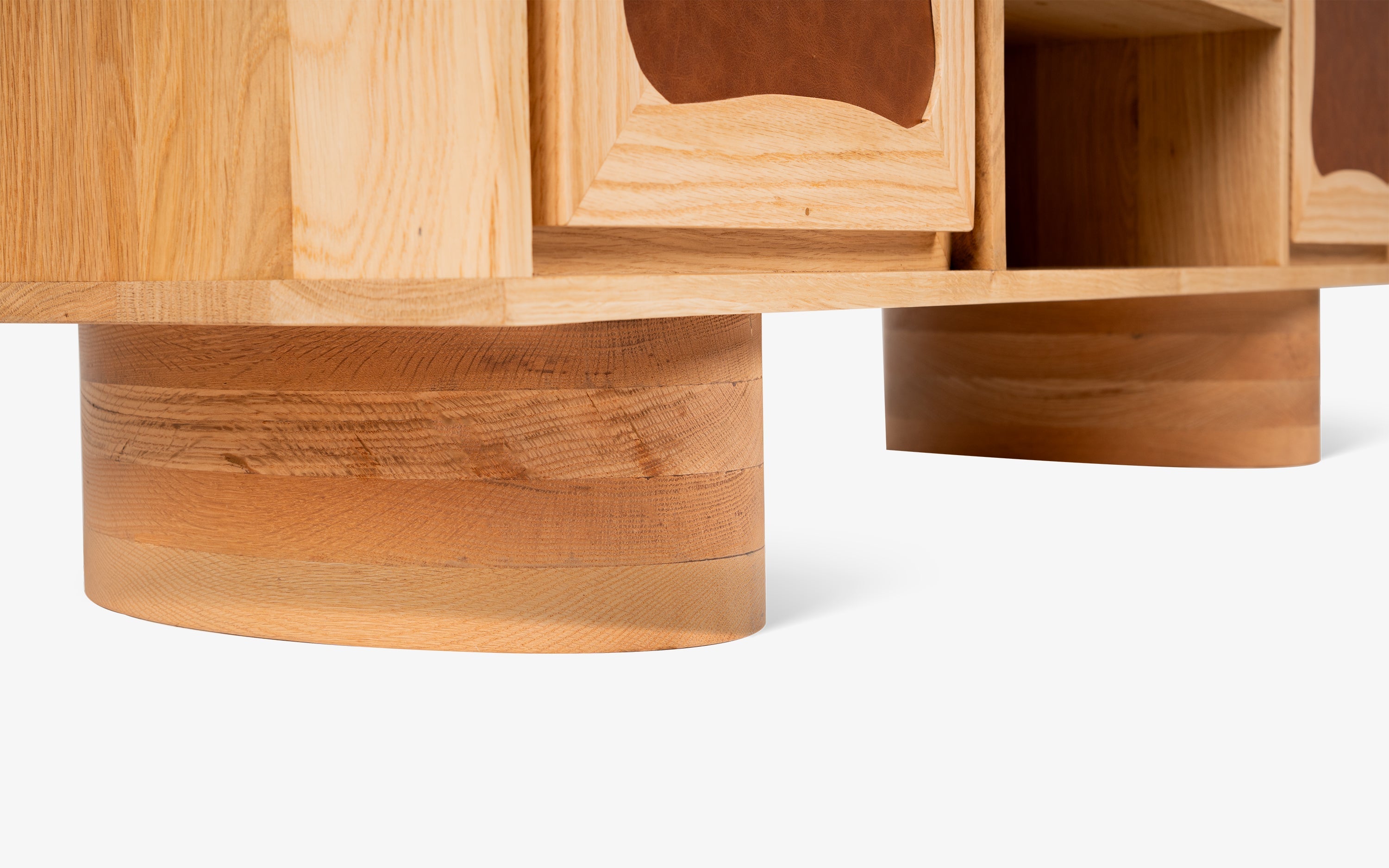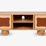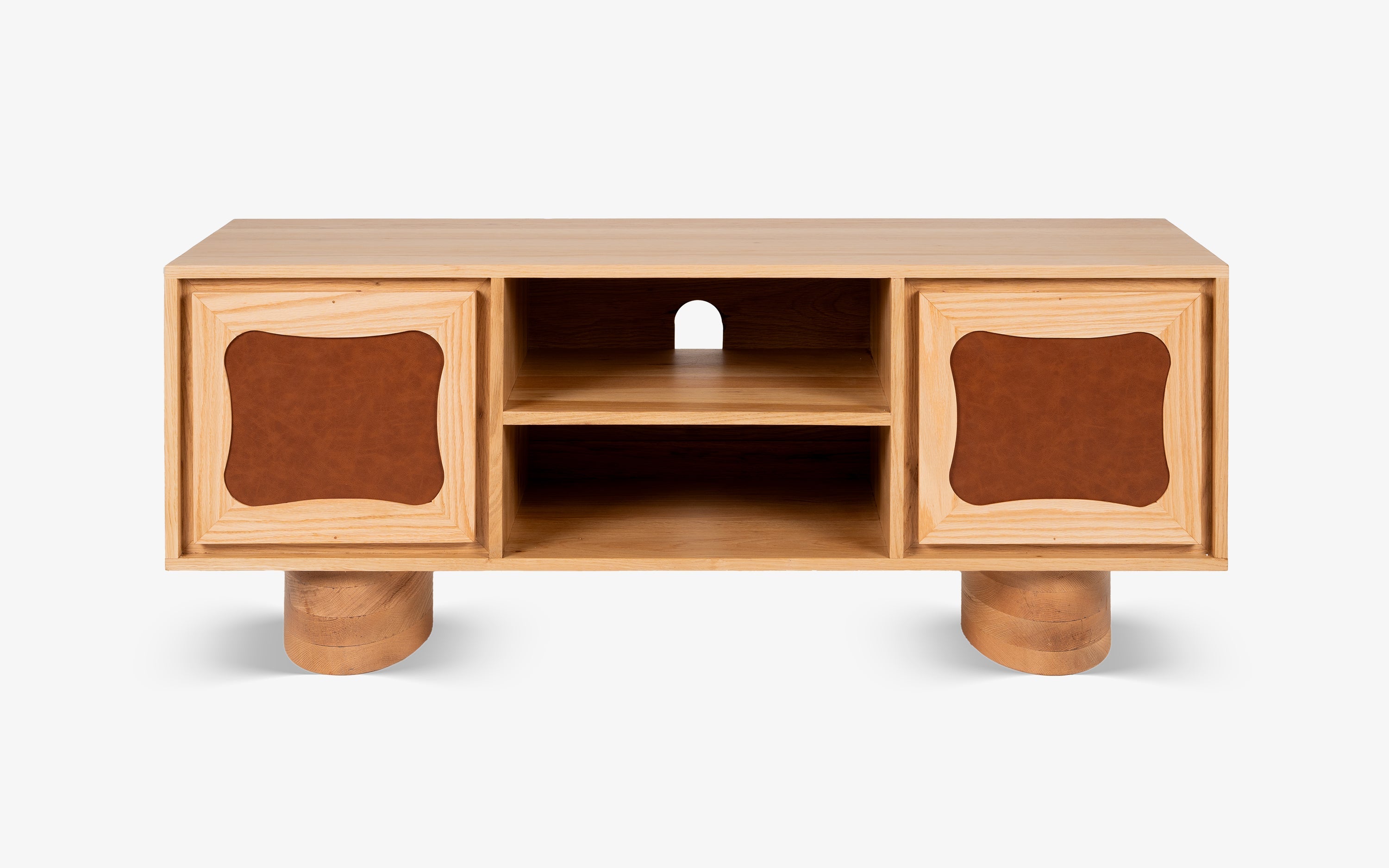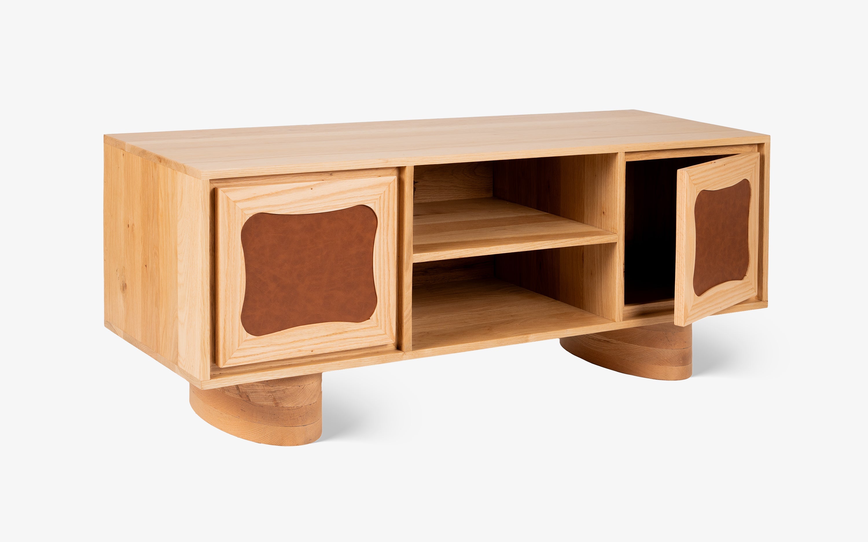 Elevate your space with the Luna TV unit, expertly crafted from solid oak wood and finished to highlight its natural beauty. This stunning entertainment unit features two unique door panels that showcase an organic form, breaking the monotony of straight lines and adding a touch of artistry to your decor. The interior is lined with luxurious leatherette fabric, creating a striking contrast that enhances the overall aesthetic, making it a perfect centerpiece for any modern home.