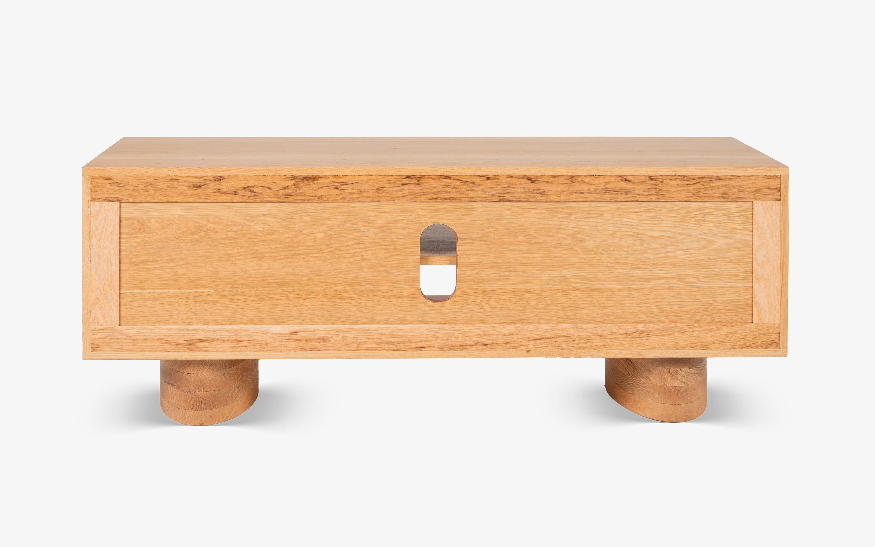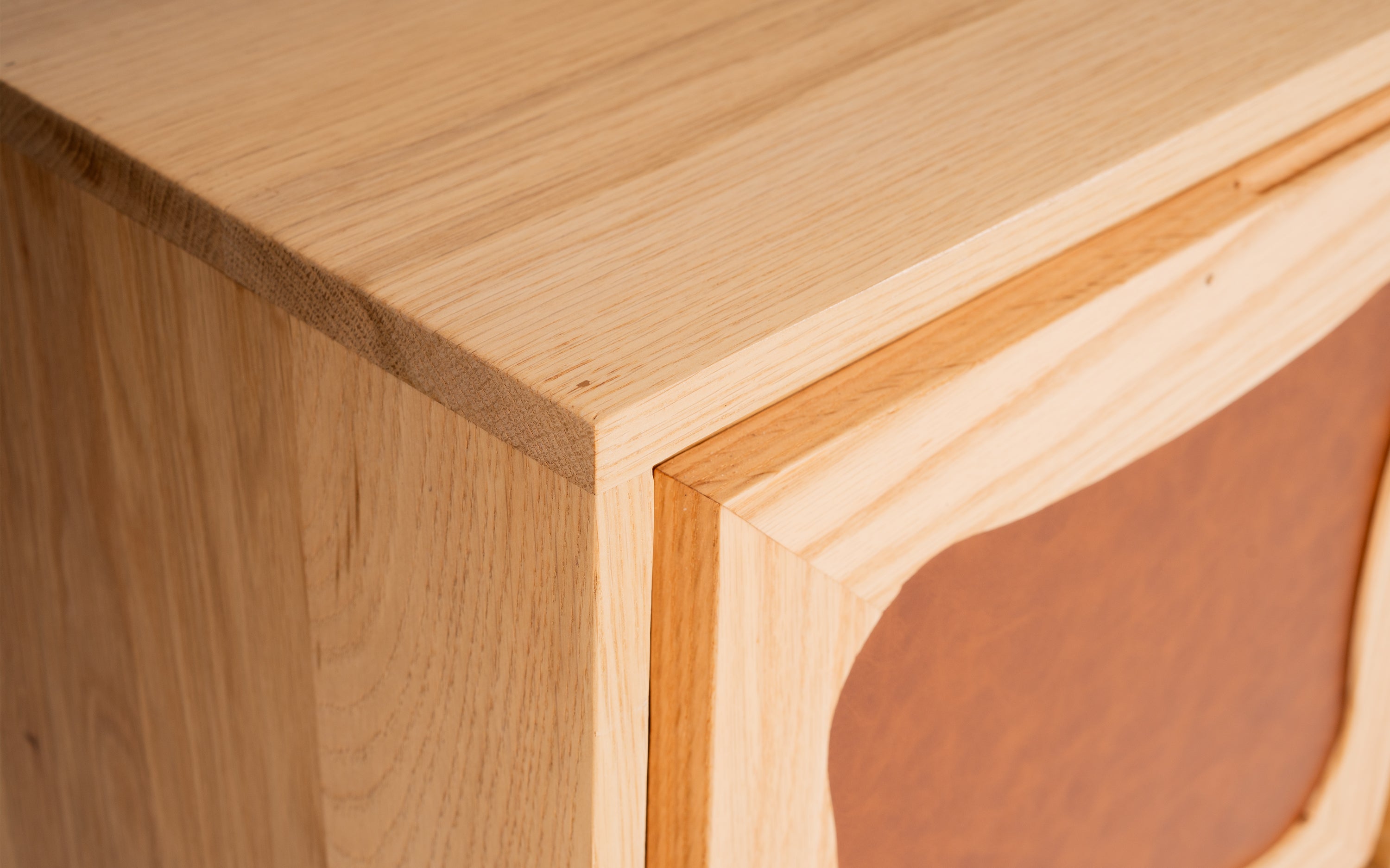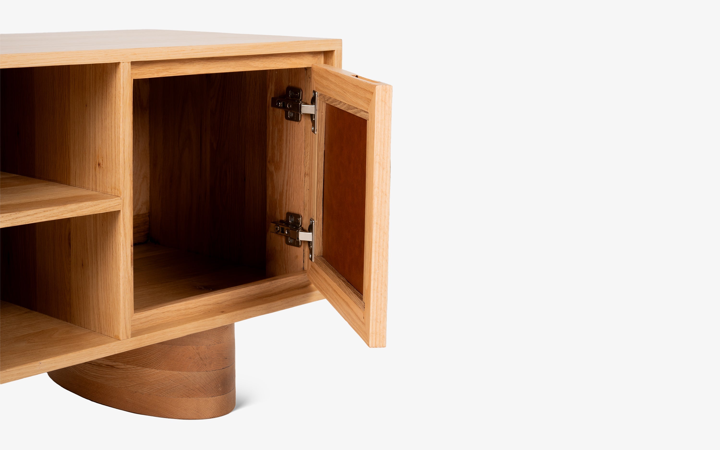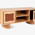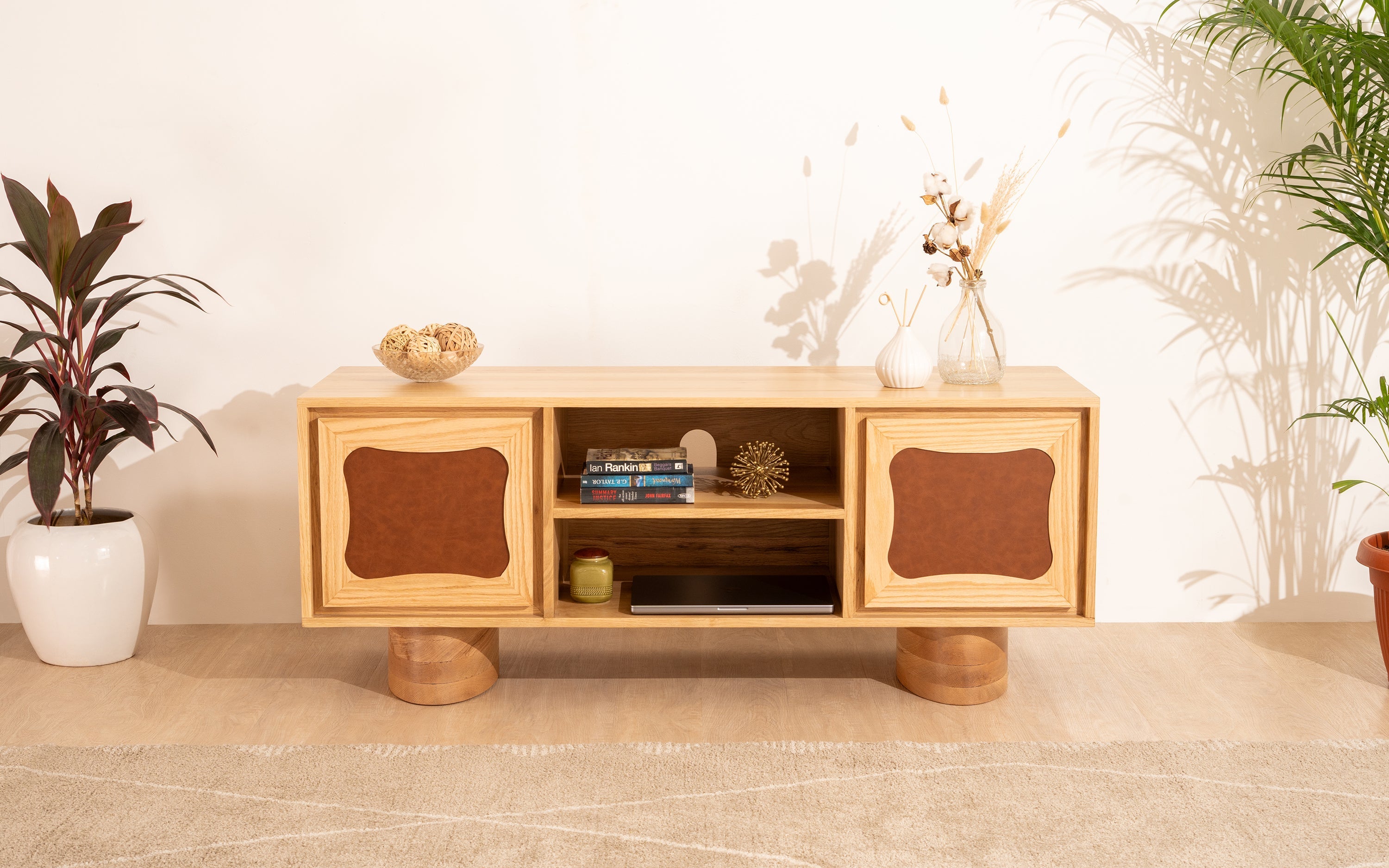 Elevate your space with the Luna TV unit, expertly crafted from solid oak wood and finished to highlight its natural beauty. This stunning entertainment unit features two unique door panels that showcase an organic form, breaking the monotony of straight lines and adding a touch of artistry to your decor. The interior is lined with luxurious leatherette fabric, creating a striking contrast that enhances the overall aesthetic, making it a perfect centerpiece for any modern home.