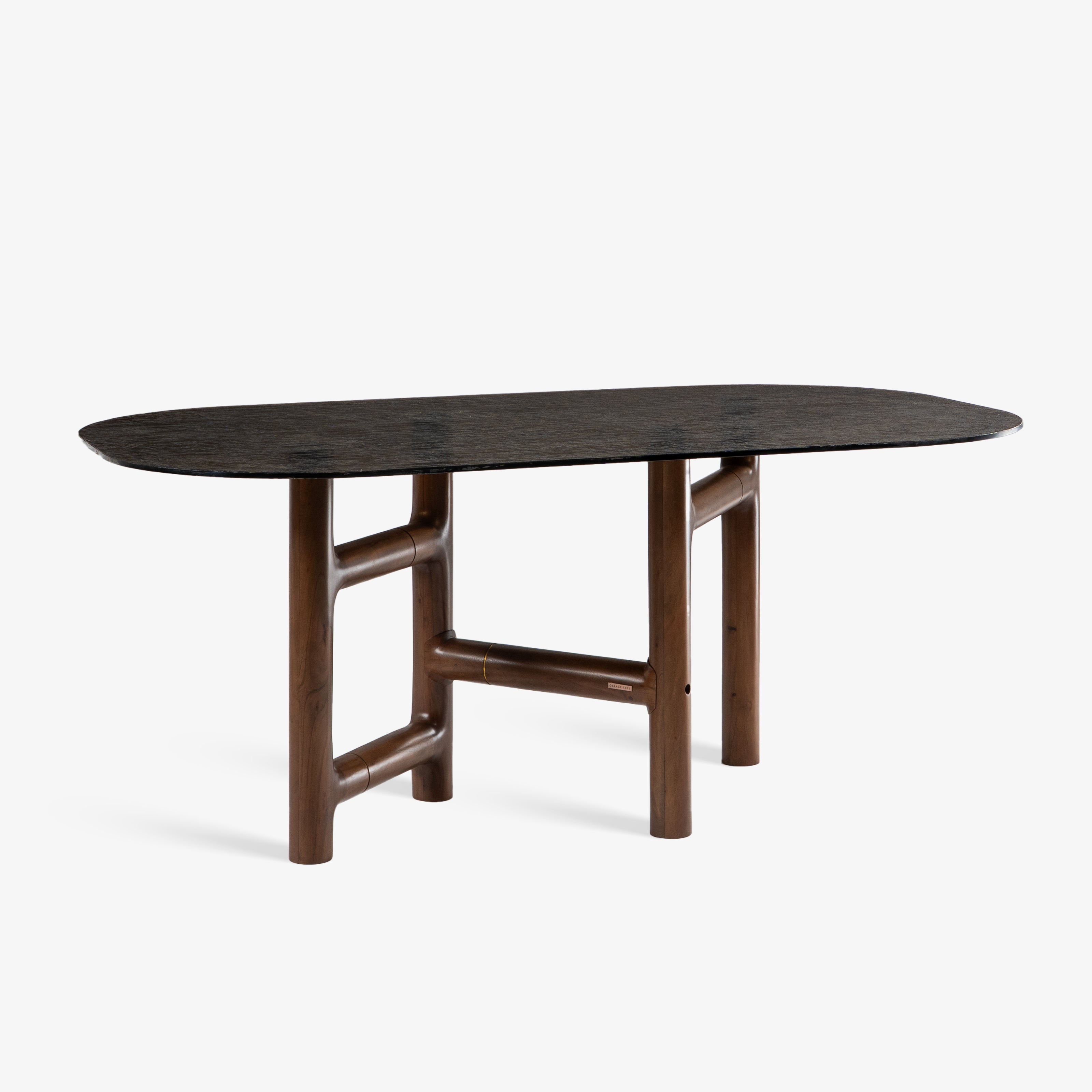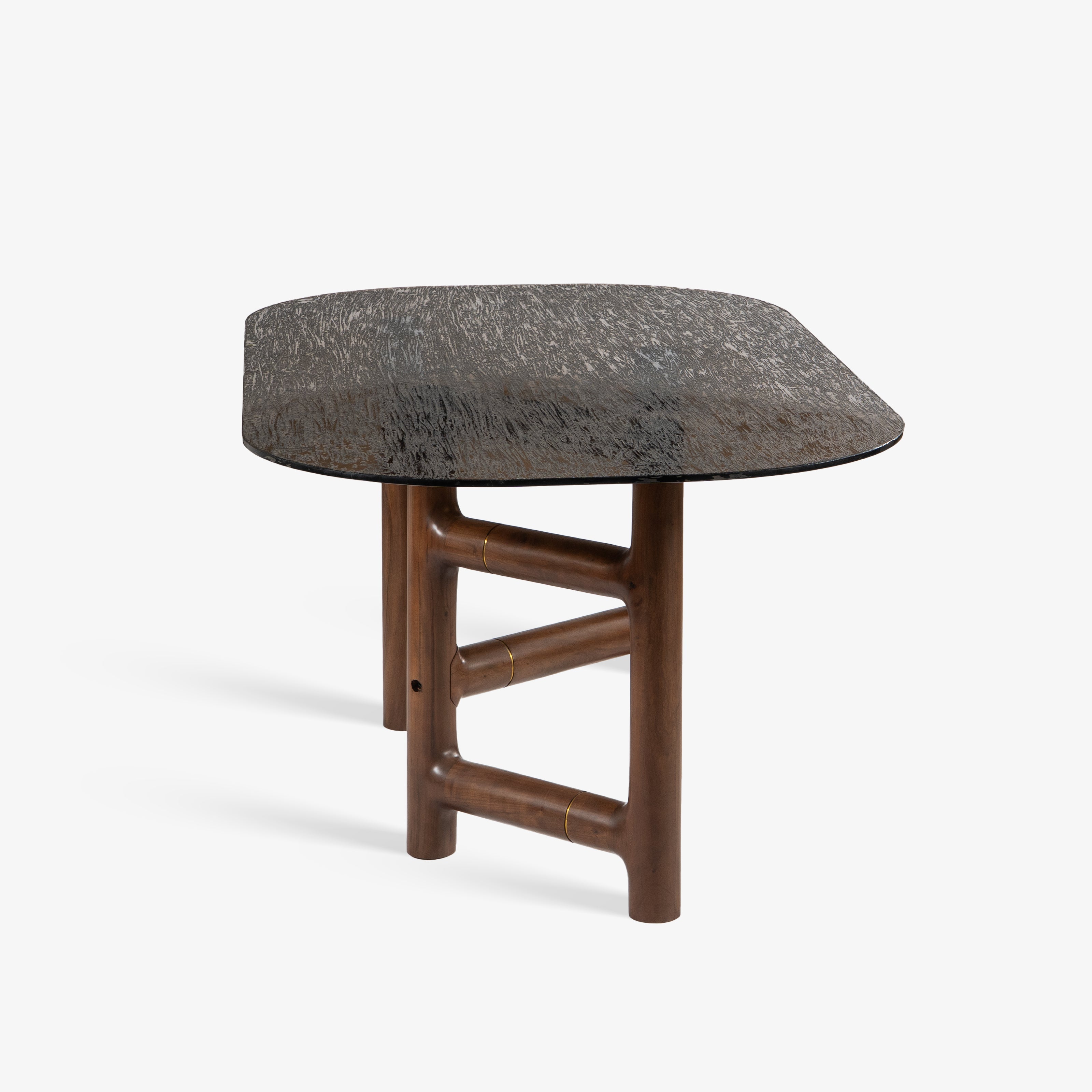 The Forma Dining Table celebrates geometric clarity. With a tinted glass top balanced on sculptural oak legs, it offers a modern interpretation of structural harmony—elevating dining to an art form.