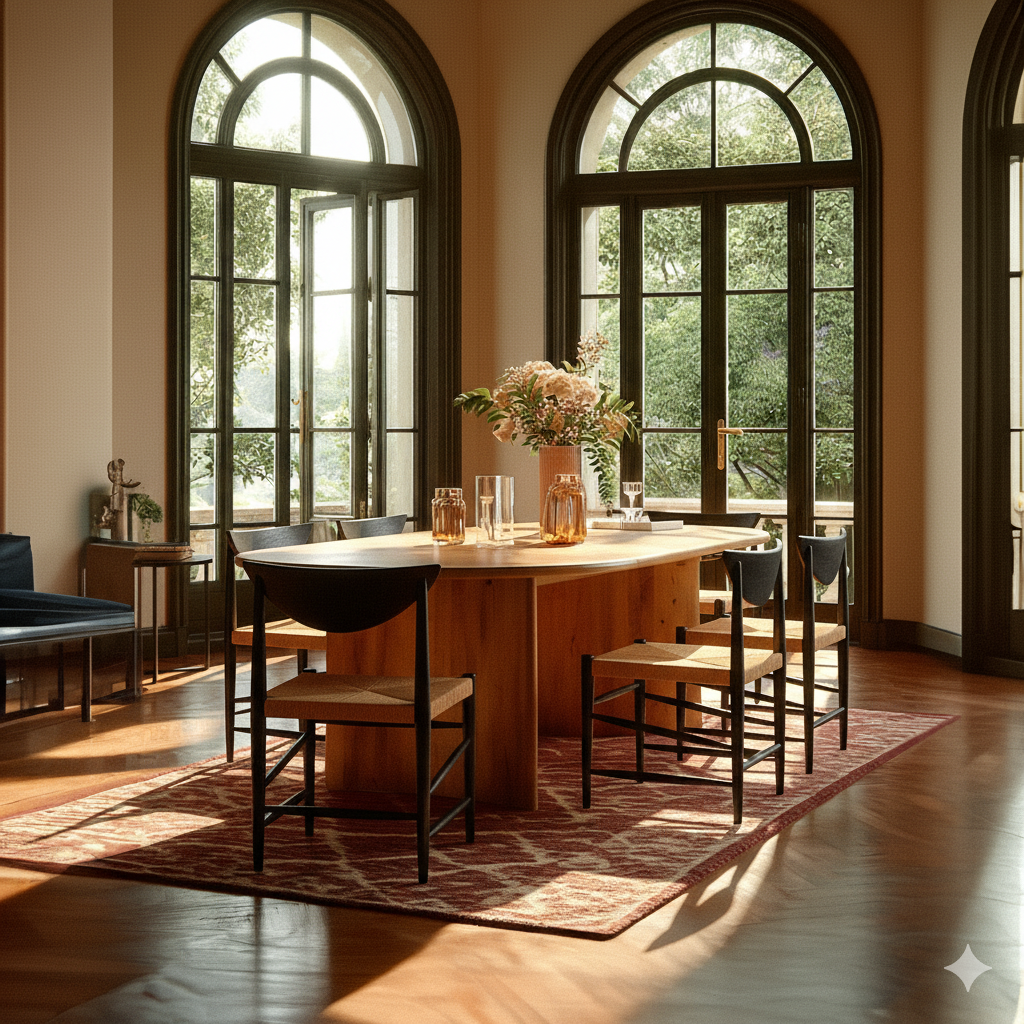 A tactile celebration of wood, the Saanra Dining Table blends sculpted craftsmanship with everyday functionality. Its organic oval top rests on twin columnar bases with curved inner cuts, echoing hand-carved forms. Fluid, functional, and full of warmth—it’s dining, redefined.